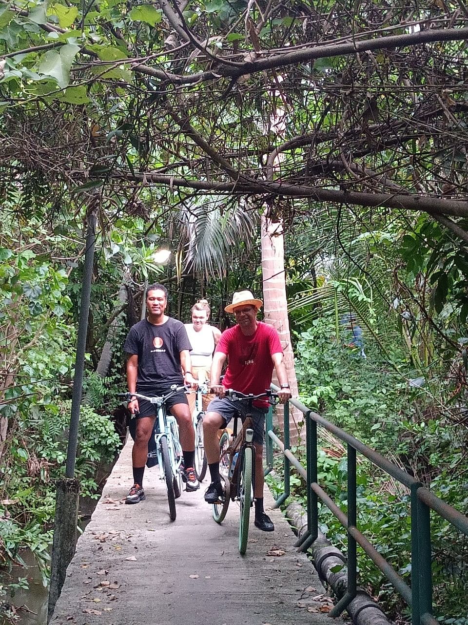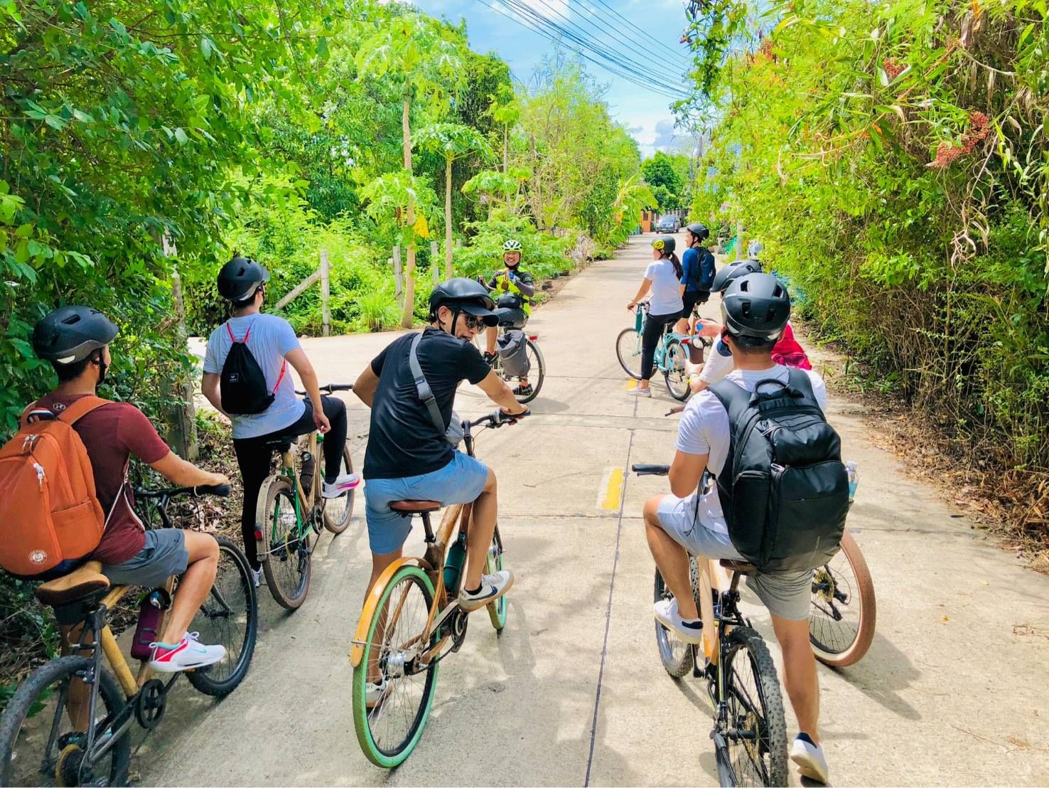 Join our beloved Bicycle Jungle Tour, available in both morning (08:30) and afternoon (13:00) sessions. This adventure guides you along tranquil rural paths, winding through local communities and verdant tropical forests. Along the way, be prepared to catch sight of electric-blue kingfishers, tree-dwelling squirrels, or even Jurassic-sized monitor lizards, some spanning over two meters in length. It's truly astonishing to think that you're merely a stone's throw away from the heart of downtown Bangkok.